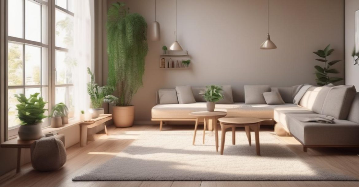 Przytulny salon w stylu skandynawskim z dywanem w kolorze kawy z mlekiem