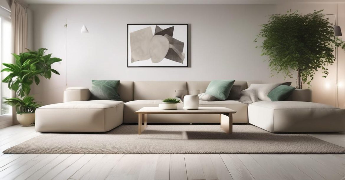 Minimalistyczna przestrzeń z ciemnym dywanem jako punktem centralnym